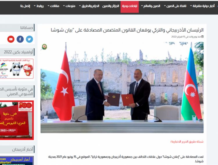 NUHÇIXAN İnformasiya Agentliyinin məlumatına görə, xəbərdə ərəbdilli oxucuların diqqətinə “Azərbaycan Respublikası ilə Türkiyə Respublikası arasında müttəfiqlik münasibətləri haqqında” 2021-ci il iyunun 15-də Şuşa şəhərində imzalanmış Şuşa Bəyannaməsinin təsdiqləndiyi çatdırılıb. Qeyd olunub ki, fevralın 12-də Azərbaycan Prezidenti İlham Əliyev bununla bağlı Qanunu imzalayıb.