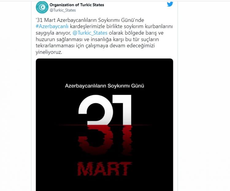 “31 Mart - Azərbaycanlıların Soyqırımı Günündə azərbaycanlı qardaşlarımızla birlikdə soyqırımı qurbanlarını yad edir və bir daha bildiririk ki, Türk Dövlətləri Təşkilatı olaraq bölgədə sülhün və əmin-amanlığın təmin edilməsi və insanlığa qarşı belə cinayətlərin təkrarlanmasının qarşısını almaq istiqamətində fəaliyyətimizi davam etdirəcəyik”.