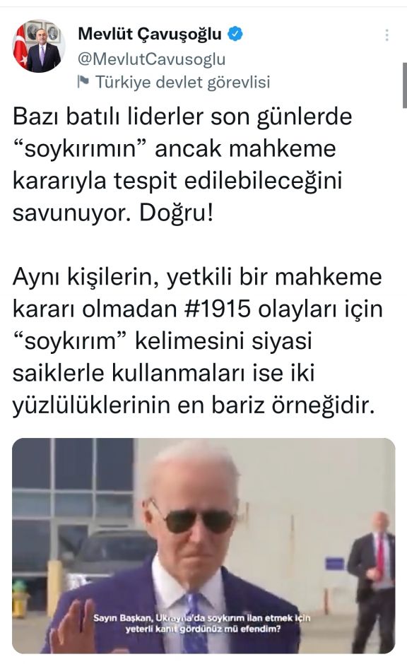 “Bəzi Qərb liderləri son günlər “soyqırımı” sözünün yalnız məhkəmə qərarından sonra istifadə oluna biləcəyini iddia edirlər. Bu doğrudur! Lakin həmin şəxslərin siyasi motivləri rəhbər tutaraq 1915-ci il hadisələri ilə bağlı məhkəmə qərarı olmadan “soyqırımı” sözünü işlətməsi onların ikiüzlülüyünün ən bariz nümunəsidir”, – Çavuşoğlu bildirib.