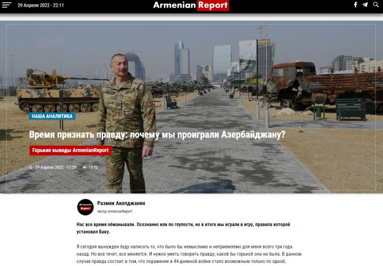 "Amma o, “torpağın bir hissəsinin müqabilində sülh” prinsipinə bağlı olan ideyanı da ortaya qoyub. O, sonda getdi və iyirmi ildən çox xalqı aldadaraq qarət edənlərə yol verib. Bəli, Robert Köçəryan və Serj Sarkisyan dollar multimilyonerinə çevriliblər. Onlar belə bir mif yaradıblar ki, bizim ordumuz düşmən ordusunu məğlub etməyə qadirdir. Bunların heç biri olmayıb. Hətta Rusiya bizi dəstəkləməyib. Hətta KTMT. Baxmayaraq ki, Ermənistanın geosiyasi manevrlər üçün real imkanını itirərək Gömrük İttifaqına və Avrasiya İqtisadi Birliyinə qoşulub. Biz Rusiyadan tam asılı ölkə statusu aldıq", - deyə məqalədə bildirilib.