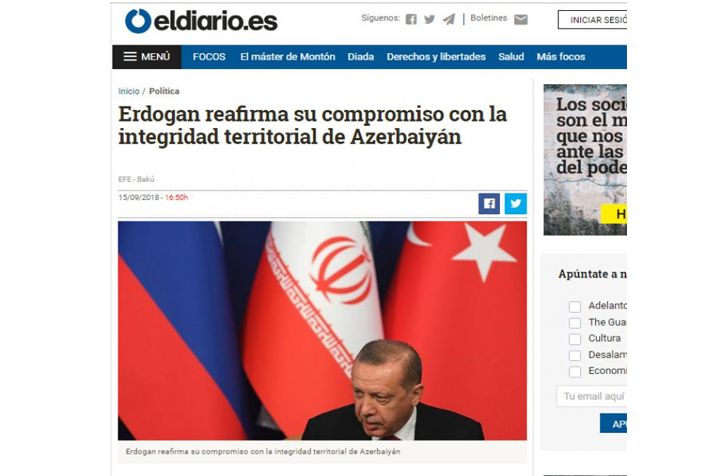 NUHÇIXAN xəbər verir ki, İspaniyanın nüfuzlu “El Confidencial” və “El Diario” qəzetlərinin elektron versiyasında “EFE” xəbər agentliyinə istinadən “Türkiyə Respublikasının Prezidenti Rəcəb Tayyib Ərdoğan Türkiyənin Azərbaycanın ərazi bütövlüyünün bərpa edilməsinə sadiq qaldığını bir daha vurğuladı” sərlövhəli məqalə yerləşdirilib.