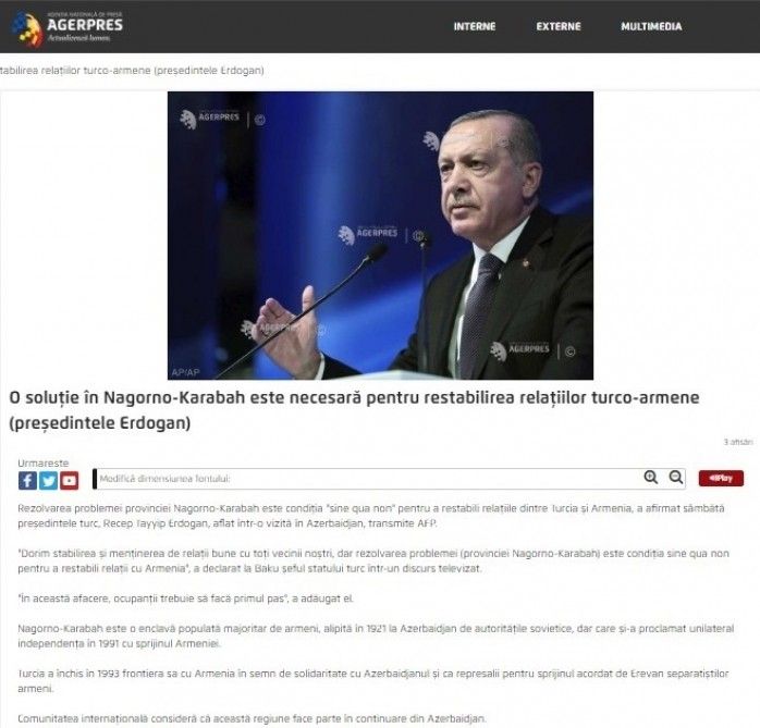 Rumıniyanın milli xəbər agentliyi “AGERPRES” Prezident Rəcəb Tayyib Ərdoğanın Azərbaycanın ərazi bütövlüyünün bərpa edilməsinə Türkiyənin sadiq qalması və Ermənistan-Azərbaycan Dağlıq Qarabağ münaqişəsi həll edilməyənədək Türkiyə-Ermənistan sərhədlərinin açılmayacağı ilə bağlı bəyanatı barədə yazır.