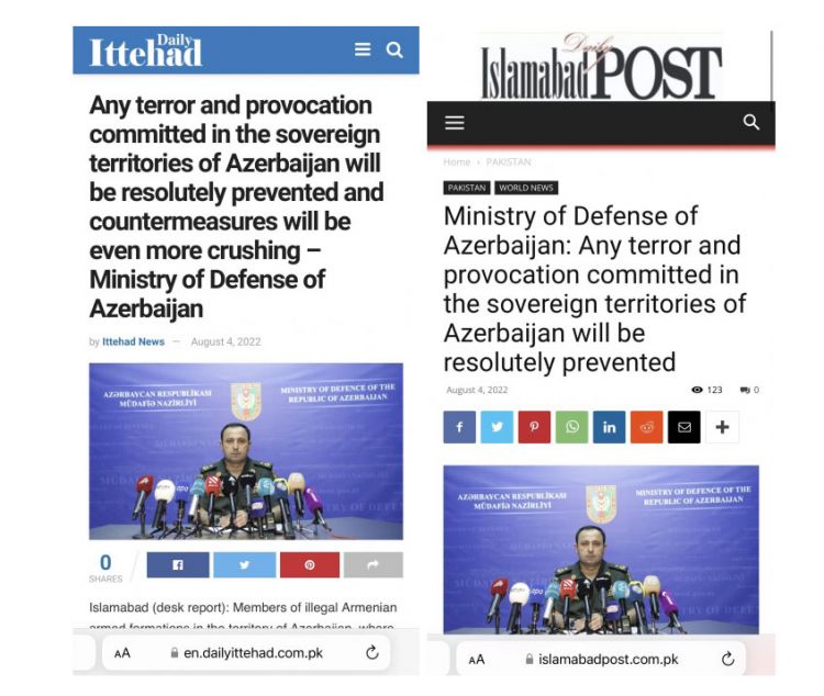 Pakistanın “Daily İttehad” və “İslamabad Post” qəzetlərində, “Pakistan Economic Net”, “Diplomatic News Agency”, “Gulf Observer” xəbər agentliklərində, həmçinin “Centreline” jurnalının veb-səhifəsində Azərbaycan Müdafiə Nazirliyinin “Qisas” cavab əməliyyatı haqqında rəsmi məlumatı yayımlanıb.