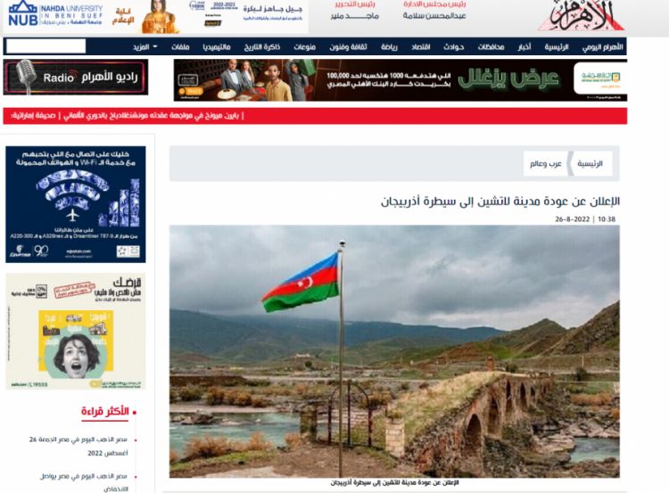 NUHÇIXAN İnformasiya Agentliyi xəbər verir ki, Misirin “Əl Əhram”, “Əl Fağr”, “Nəbd”, Birləşmiş Ərəb Əmirliklərinin “Emarat”, Livanın “Əl Nashra” qəzetlərində avqustun 26-da Laçın şəhərində Azərbaycanın Dövlət Bayrağının ucaldılması haqqında materiallar dərc olunub.