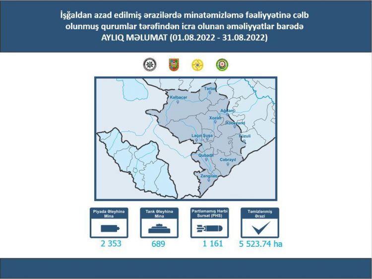 ANAMA-dan NUHÇIXAN İnformasiya Agentliyinə verilən məlumata görə, avqustun 1-dən 31-dək Tərtər, Ağdam, Füzuli, Şuşa, Qubadlı, Xocalı, Cəbrayıl və Zəngilanda aparılan minatəmizləmə əməliyyatları zamanı piyada əleyhinə 2 353, tank əleyhinə 689 mina (cəmi 3 042) və 1131 partlamamış hərbi sursat aşkarlanaraq zərərsizləşdirilib.