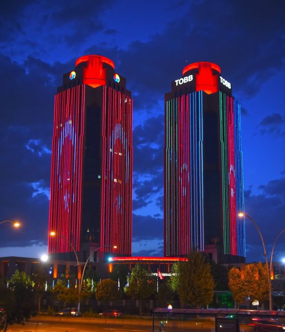 NUHÇIXAN İnformasiya Agentliyi xəbər verir ki, Ankara şəhərinin məşhur TOBB əkiz qüllələri Azərbaycan və Türkiyə bayraqlarının rəngləri ilə işıqlandırılıb.