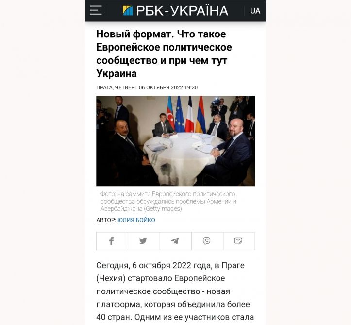 Ukraynanın nüfuzlu informasiya agentlikləri və xəbər portalları Azərbaycan Prezidenti İlham Əliyevin Praqaya səfərini, Türkiyə Prezidenti Rəcəb Tayyib Ərdoğan, Fransa Prezidenti Emmanuel Makron, Avropa İttifaqı Şurasının Prezidenti Şarl Mişel və Ermənistan Respublikasının Baş naziri Nikol Paşinyan ilə görüşlərini geniş işıqlandırıb.