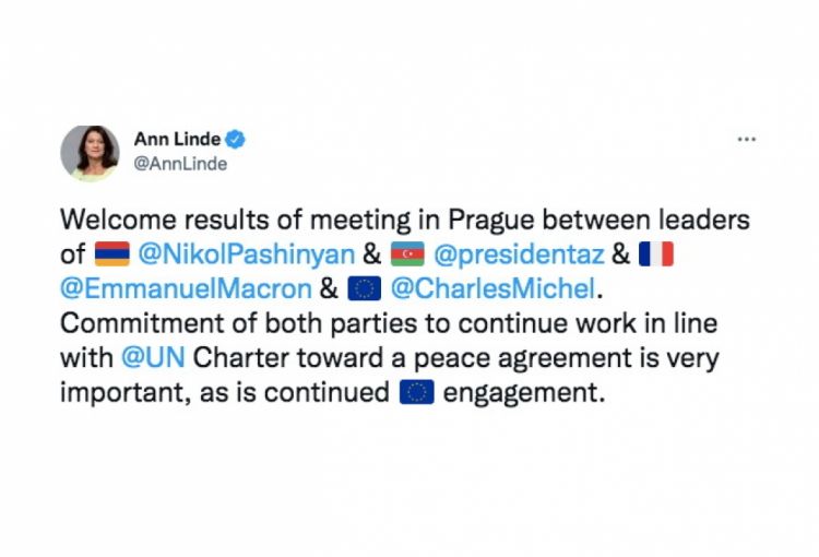 İsveçin xarici işlər naziri Ann Linde Praqada Azərbaycan Prezidenti İlham Əliyev ilə Ermənistanın Baş naziri Nikol Paşinyan arasında keçirilən görüşün nəticələrini alqışlayıb.
