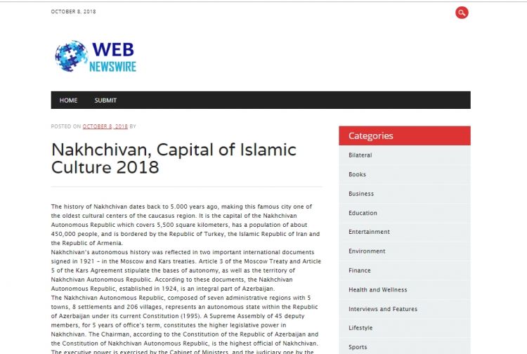 NUHÇIXAN xəbər verir ki, dünyanın nüfuzlu internet portallarından sayılan www.webnewswire.com saytında Naxçıvan haqqında ingilis dilində məqalə yer alıb. “Naxçıvan İslam Mədəniyyətinin Paytaxtı-2018” başlıqlı məqalədə Naxçıvanın tarixi və idarəçilik sistemi haqqında məlumat verilib.