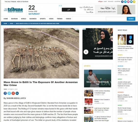 Bəhreynin “The Daily Tribune. News of Bahrain” qəzetində Azərbaycanın Səudiyyə Ərəbistanındakı səfiri Şahin Abdullayevin “Edillidə aşkarlanan kütləvi məzarlıq Ermənistanın müharibə cinayətlərinin daha bir sübutudur” sərlövhəli məqaləsi dərc olunub.