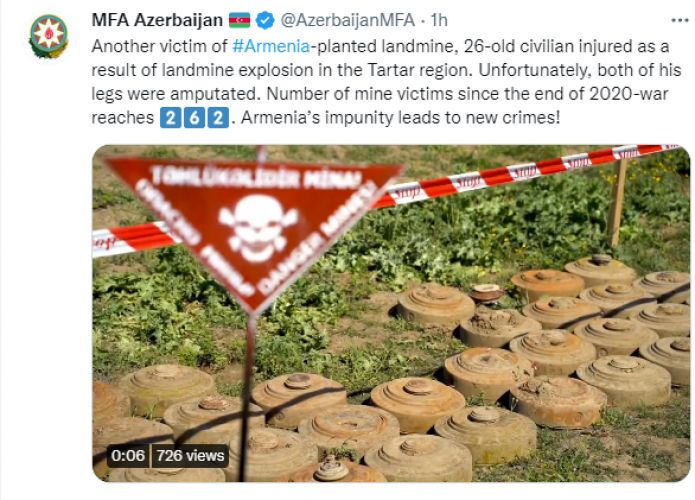 Bildirilib ki, Ermənistan tərəfindən basdırılmış minanın daha bir qurbanı, 26 yaşlı mülki şəxs Tərtər rayonunda minanın partlaması nəticəsində yaralanıb. “Təəssüf ki, onun hər iki ayağı amputasiya olunub. 2020-ci il müharibəsinin sonundan indiyədək mina qurbanlarının sayı 2️62 nəfərə çatıb. Ermənistanın cəzasızlığı yeni cinayətlərə yol açır”, - deyə paylaşımda qeyd edilib.