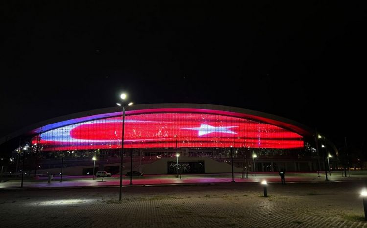 Türkiyənin Cümhuriyyət Günü münasibətilə Bakı Su İdman Sarayı bu ölkənin bayrağı ilə işıqlandırılıb.