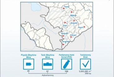 ANAMA-dan NUHÇIXAN İnformasiya Agentliyinə bildiriblər ki, oktyabrın 24-dən 29-dək Tərtər, Ağdam, Şuşa, Xocavənd, Füzuli, Qubadlı, Cəbrayıl və Zəngilan rayonlarının ərazilərində aparılmış minatəmizləmə əməliyyatları zamanı piyada əleyhinə 49, tank əleyhinə 97 mina və 398 partlamamış hərbi sursat aşkarlanaraq zərərsizləşdirilib.