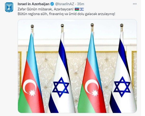 İsrailin Azərbaycandakı səfirliyi 8 Noyabr - Zəfər Günü münasibətilə Azərbaycanı təbrik edib.