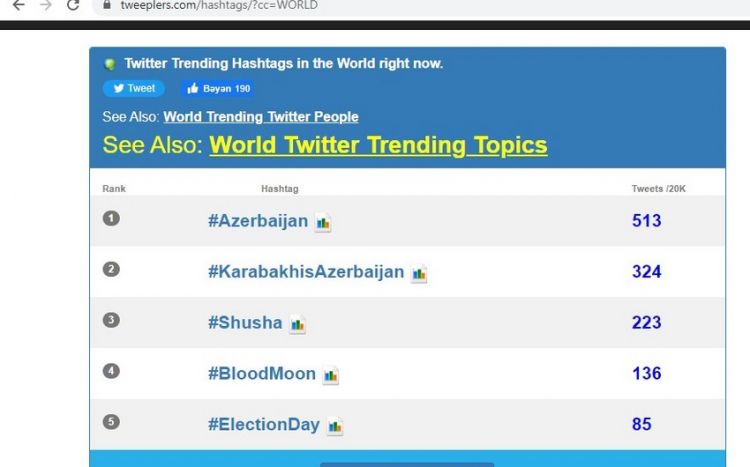 8 Noyabr - Zəfər Günü ilə əlaqədar çoxsaylı paylaşımlara görə #Azerbaijan həştəqi tviterin dünya trendində 1-ci yerə yüksəlib.