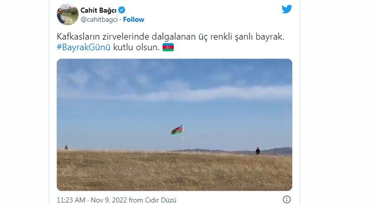 Türkiyənin Azərbaycandakı səfiri Cahit Bağçı 9 Noyabr - Dövlət Bayrağı Günü münasibətilə Azərbaycanı təbrik edib.