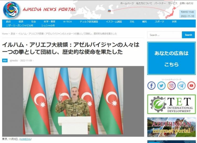 Yaponiyanın “ajmedia.jp” portalı Azərbaycan Silahlı Qüvvələrinin Müzəffər Ali Baş Komandanı, Prezident İlham Əliyevin noyabrın 8-də Şuşada hərbçilər qarşısında çıxışı zamanı söylədiyi fikirlər barədə məlumatlar dərc edib.