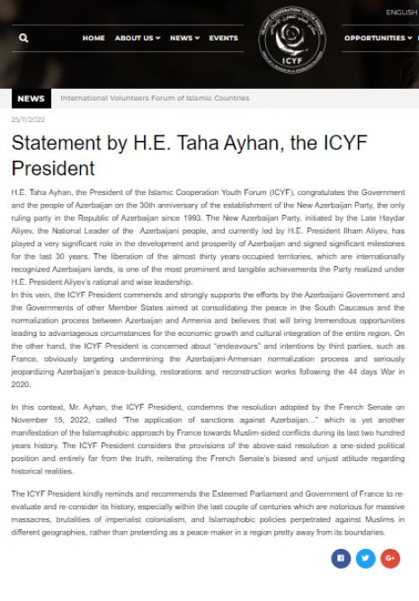 Diqqətə çatdırılır ki, Azərbaycan-Ermənistan münasibətlərində normallaşdırma səylərinə qarşı olan, atılan sülh addımlarına xələl gətirən, 44 günlük Vətən müharibəsindən sonra Azərbaycanın sülhməramlı çağırışlarına, eləcə də işğaldan azad olunan ərazilərdəki quruculuq işlərinə maneə olmağa çalışan bəzi tərəflərin fəaliyyəti narahatedicidir. Bu kontekstdə Fransa senatının 2022-ci il noyabrın 15-də Azərbaycana qarşı qəbul etdiyi məlum qətnamə kəskin şəkildə pislənilir. Qeyd olunur ki, bu hüquqa zidd addım Fransanın müsəlmanlara qarşı İslamofobiya yanaşmasının növbəti təzahürüdür. Məlum sənəddəki müddəalar qərəzli və ədalətsizdir.