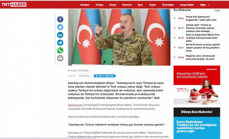 Azərbaycan Prezidenti İlham Əliyevin noyabrın 25-də Bakıda, ADA Universitetində “Orta Dəhliz boyunca: geosiyasət, təhlükəsizlik və iqtisadiyyat” mövzusunda keçirilən beynəlxalq konfransdakı dərin məzmunlu nitqi Türkiyənin aparıcı kütləvi informasiya vasitələri tərəfindən geniş şəkildə işıqlandırılıb.