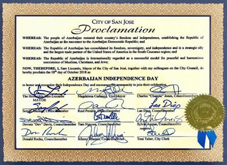 Sonda 18 oktyabr tarixi San-Xose şəhərində “Azərbaycanın Müstəqillik Günü” elan edilir və bütün şəhər sakinləri bu bayramı qeyd etməyə dəvət olunur.
