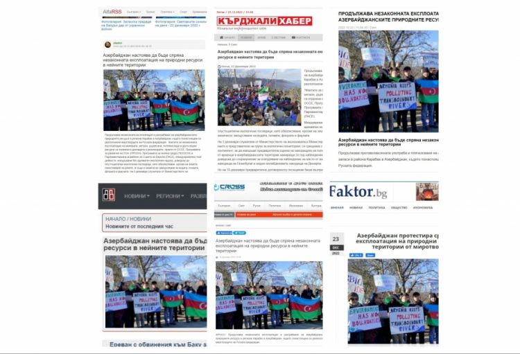 Azərbaycanın Bolqarıstandakı səfirliyindən NUHÇIXAN İnformasiya Agentliyinə bildirilib ki, bu ölkənin bir sıra aparıcı mətbuat orqanları və xəbər portallarında Rusiya sülhməramlı kontingentinin müvəqqəti yerləşdiyi Azərbaycan ərazilərində ermənilər tərəfindən təbii sərvətlərimizin qeyri-qanuni istismarı ilə bağlı Şuşa-Laçın yolunda davam edən etiraz aksiyasına dair geniş məlumatlar yayılıb. Həmin məlumatlarda Şuşa-Laçın yolunda keçirilən etiraz aksiyasının Azərbaycan ərazilərində aparılan qeyri-qanuni fəaliyyətlərə qarşı ölkə ictimaiyyətinin haqlı narazılığının nəticəsi olduğu qeyd edilib.