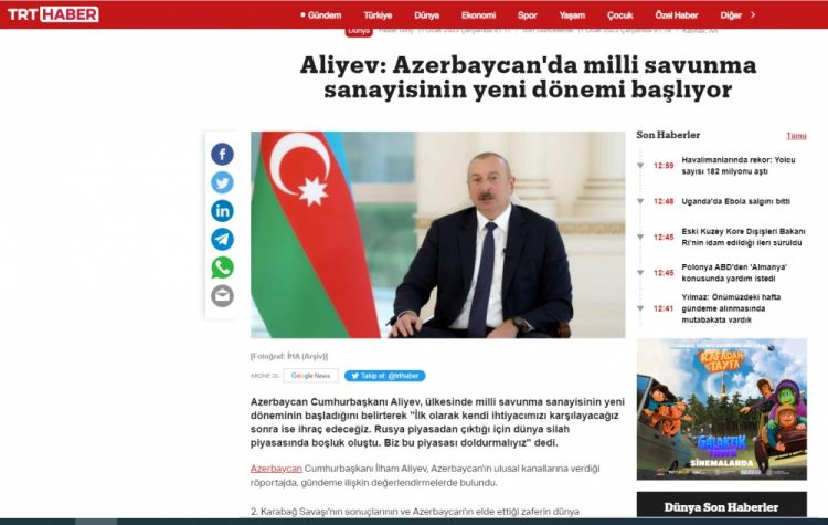 Anadolu və İHA xəbər agentlikləri, “TRT Haber”, “TRT Avaz” və digər telekanallar, “Yeni Akit”, “Milliyet” və sair qəzetlər məlumat verir ki, Prezident İlham Əliyev böyük inamla Azərbaycanın milli müdafiə sənayesini müasir dövrün standartlarına yüksəltməkdə qərarlıdır.