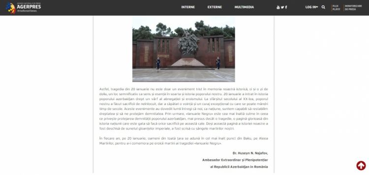 NUHÇIXAN İnformasiya Agentliyi xəbər verir ki, Rumıniyanın AGERPRES milli xəbər agentliyi Azərbaycanın Rumıniyadakı səfiri Hüseyn Nəcəfovun “Azərbaycanın müstəqilliyi uğrunda mübarizənin simvoluna çevrilmiş qanlı 20 Yanvar 1990-cı il hadisələrindən 33 il ötür” sərlövhəli məqaləsini dərc edib.