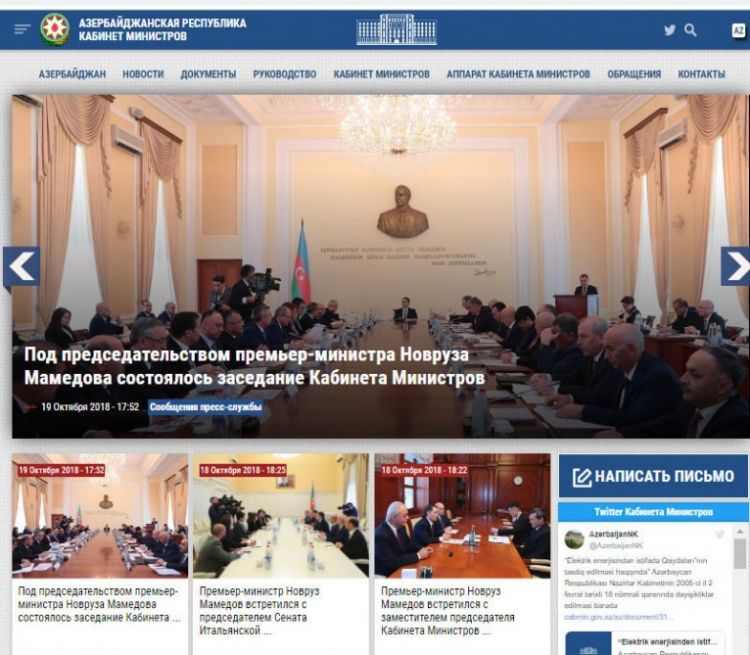 Həmçinin bütün bunlar barədə indi “Twitter” sosial şəbəkəsindən də operativ məlumat əldə etmək mümkündür. Hazırda Nazirlər Kabinetinin “Twitter” səhifəsindən (@AzerbaijanNK3) dildə - Azərbaycan, rus və ingilis dillərində paylaşımlar edilir.