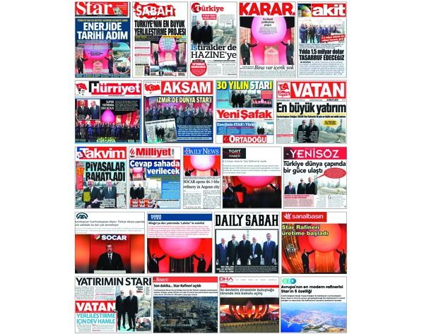 "Hürriyet” qəzeti isə "Super yatırıma böyük açılış” başlıqlı xəbəri manşetə çıxarıb. Hər iki dövlət başçısının "Star” ilə bağlı fikirlərinə geniş yer ayıran məqalədə qeyd olunub ki, neft emalı zavodu mühüm siyasi və iqtisadi əhəmiyyətə malikdir. Təməli 2011-ci il oktyabrın 25-də prezidentlər İlham Əliyev və Rəcəb Tayyib Ərdoğan tərəfindən qoyulan zavod Türkiyənin idxaldan asılılığını azaltmaqla ölkə iqtisadiyyatına 1,5 milyard dollar əlavə gəlir qazandıracaq.