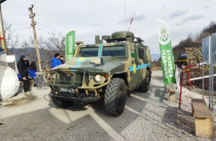 Rusiya sülhməramlılarına məxsus avtomobillər Laçın-Xankəndi yolunda dinc aksiya keçirilən ərazidən intensiv hərəkət edirlər.