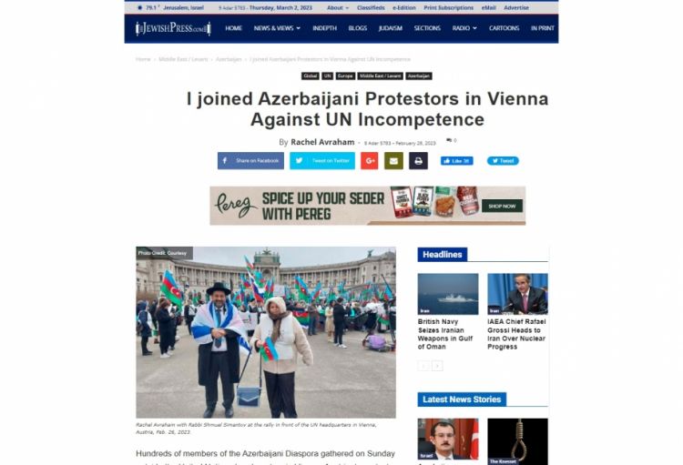 ABŞ-ın ən böyük yəhudi qəzetlərindən olan “The Jewish Press”də “BMT-nin səriştəsizliyinə qarşı Vyanada azərbaycanlı etirazçılara qoşuldum” sərlövhəli məqalə dərc olunub.