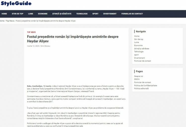 Rumıniyanın “Style Guide” portalı Qlobal Bakı Forumunda iştirak edən sabiq Prezident Emil Konstantineskunun Ümummilli Lider Heydər Əliyev barədə fikirlərini yayıb.