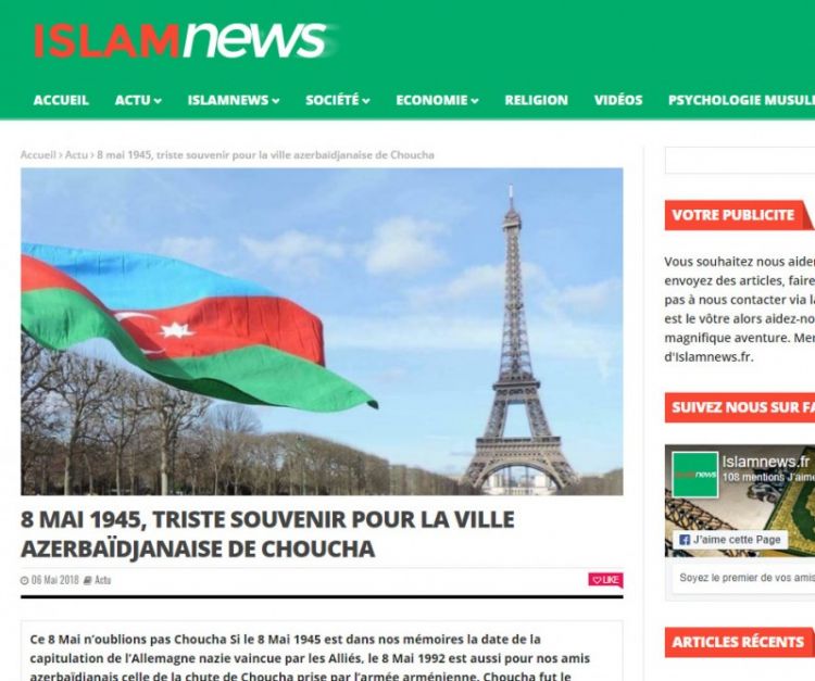 Fransanın Islamnews.fr portalında Fransada Azərbaycanın Dostları Assosiasiyasının prezidenti Jan-Fransua Manselin Azərbaycanın Şuşa şəhərinin Ermənistan silahlı qüvvələri tərəfindən işğalından bəhs edən məqalə yayılıb.