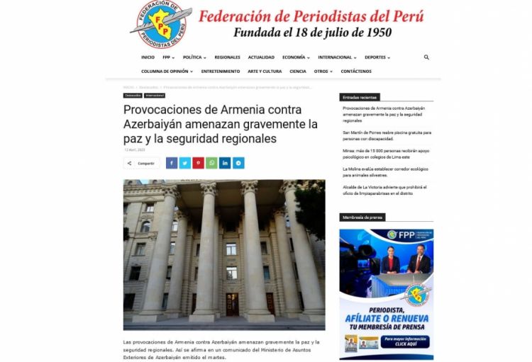 Peru Jurnalistləri Federasiyasının rəsmi portalında qurumun vitse-prezidenti, tanınmış perulu jurnalist Rikardo Sançezin “Ermənistanın Azərbaycana qarşı təxribatları regional sülh və təhlükəsizliyi ciddi şəkildə təhdid edir” başlıqlı məqaləsi dərc edilib.