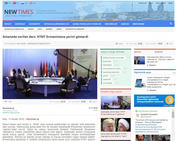 Rəsmi İrəvan xeyli vaxtdır ki, "fərqli" xarici siyasət yeritdiyindən və "uğurlar" əldə etdiyindən dəm vururdu. Hakimiyyətə qulluq edən KİV də müxtəlif aspektlərdə Ermənistan rəhbərliyinin "uğurları"ndan yazırdı. Bütün bu yalançı təsəvvürlər Kollektiv Təhlükəsizlik Müqaviləsi Təşkilatının Astana sammitində sabun köpüyü kimi dağıldı. Astanadan erməni nümayəndə heyəti məyus qayıtdı. Onlar Ermənistanın mövqeyinin təşkilatda nəzərə alınmadığından gileylidirlər. Əslində isə təşkilat üzvləri reallığa və hüquqi normalara uyğun hərəkət ediblər. Ermənistana anladıblar ki, kollektiv təhlükəsizliyi təmin etmək üçün yaradılan KTMT əsassız erməni iddialarını təmin etməli olan struktur deyil. Burada hər bir üzv dövlətin ilk növbədə kollektiv təhlükəsizliyə verdiyi töhfə əsas sayılır. Bunun fonunda isə KTMT-nin Azərbaycanla maraqlandığı haqqında informasiyalar yayılmağa başlayıb. Belə məlum olur ki, həmin təşkilat öz üzvü Ermənistandan çox Azərbaycana qiymət verir. Məsələnin bu aspektinin geosiyasi məqamları üzərində geniş dayanmağa ehtiyac duyulur.