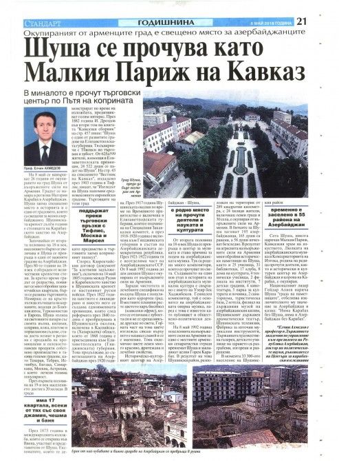 Bolqarıstanın nüfuzlu “Standart” qəzetində Azərbaycan Respublikasının Prezidenti yanında Dövlət İdarəçilik Akademiyasının professoru, siyasi elmlər doktoru, Qarabağ Araşdırmalar Mərkəzinin rəhbəri Elçin Əhmədovun Şuşanın işğalı ilə bağlı məqaləsi dərc edilib.