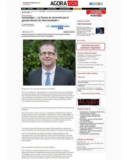 Fransanın “Agoravox” portalında Fransa-Azərbaycan parlamentlərarası dostluq qrupunun vitse-prezidenti Bertrand Sorrenin “Azərbaycan: Fransa Dağlıq Qarabağ hökumətini tanımır” adlı müsahibəsi dərc olunub.
