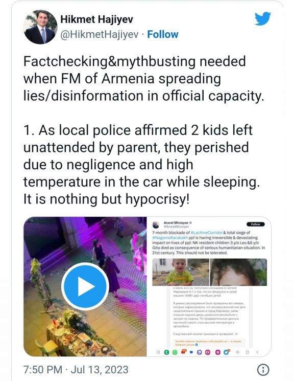 “Birincisi, yerli polis valideynlərinin nəzarətsizliyi səbəbilə iki azyaşlının səhlənkarlıq və avtomobildəki yüksək temperatur nəticəsində yuxudaykən öldüyünü təsdiqləyib. Bu, riyakarlıqdan başqa bir şey deyil. İkincisi, Laçın sərhəd-buraxılış məntəqəsi fəaliyyət göstərir və ümumiyyətlə bunun bu hadisə ilə heç bir əlaqəsi yoxdur. Üçüncüsü, Ermənistan xarici işlər naziri, yəqin ki, Laçın sərhəd-buraxılış məntəqəsini qeyd etməklə, guya Qarabağda ərzaq qıtlığı varmış kimi yanıltmağa çalışır. Amma Xankəndi restoranından olan videoda bunun əksi görünür”, - o vurğulayıb.