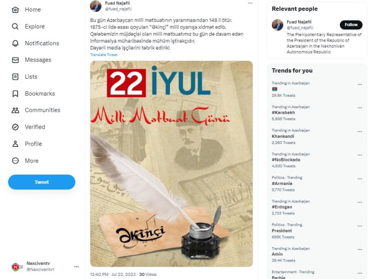 NUHÇIXAN xəbər verir ki, Naxçıvan Muxtar Respublikasında Azərbaycan Respublikası Prezidentinin səlahiyyətli nümayəndəsi Fuad Nəcəfli rəsmi tviter hesabında jurnalistləri təbrik edib.