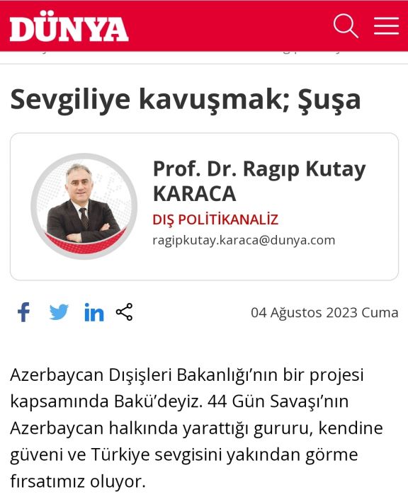 Türkiyənin Aydın Universitetinin müəllimi professor Ragıp Kutay Karacanın " Sevgiliye kavuşmak; Şuşa" adlı məqaləsi dərc olunub. Məqalədə Ermənistanın işğaladan azad olunmuş ərazilərimizdə törətdiyi vəhşiliklərdən, mina terrorundan, bu gün Şuşanın əvvəlki görkəminə qaytarılmasından və Şuşa Bəyannaməsinin əhəmiyyətindən bəhs olunub.