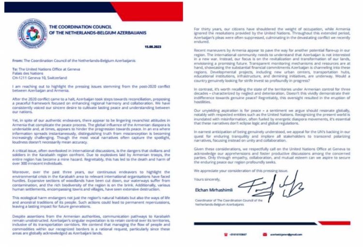Niderland-Belçika Azərbaycanlıları Koordinasiya Şurası beynəlxalq təşkilatları erməni uydurmalarına inanmamağa, işğaldan azad edilmiş Qarabağ bölgəsində irimiqyaslı bərpa-yenidənqurma layihələri həyata keçirmək məqsədilə çoxmilyardlı sərmayələr yatıran Azərbaycanın sülhsevər mövqeyini dəstəkləməyə və tərəflər arasında konstruktiv dialoqun təşkilinə yardım göstərməyə çağırıb.