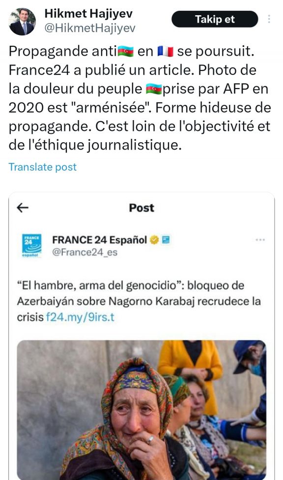 O bildirib ki, Fransanın “France24” məqaləsində azərbaycanlı qadının 2020-ci ildə çəkilən fotosu “erməniləşdirilib”: