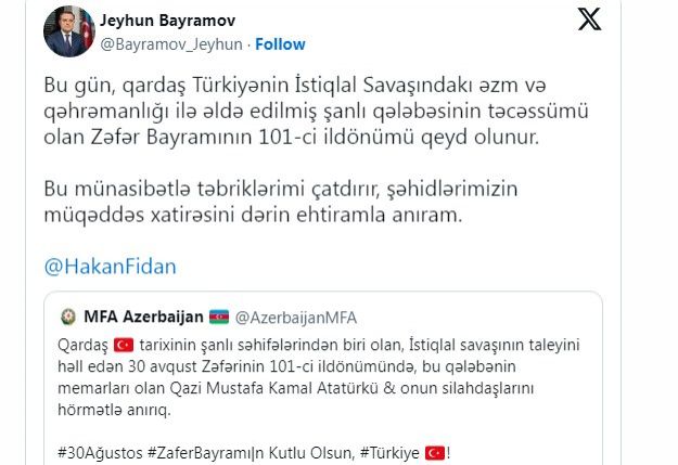 Azərbaycanın xarici işlər naziri Ceyhun Bayramov qardaş Türkiyəni Zəfər Günü münasibətilə təbrik edib.