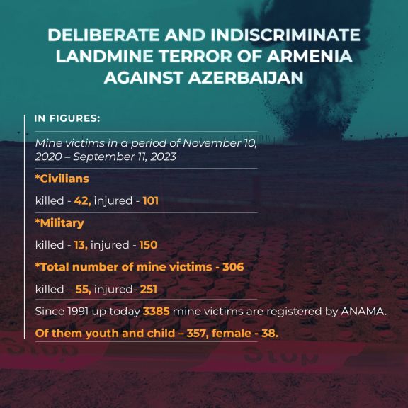 "1991-ci ildən bu günə kimi 3 385 azərbaycanlı Ermənistanın basdırdığı minaların qurbanı olub. Bunlar Ermənistanın Azərbaycana qarşı sistemli və məqsədyönlü şəkildə mina terroru siyasətinin dəhşətli rəqəmləridir".
