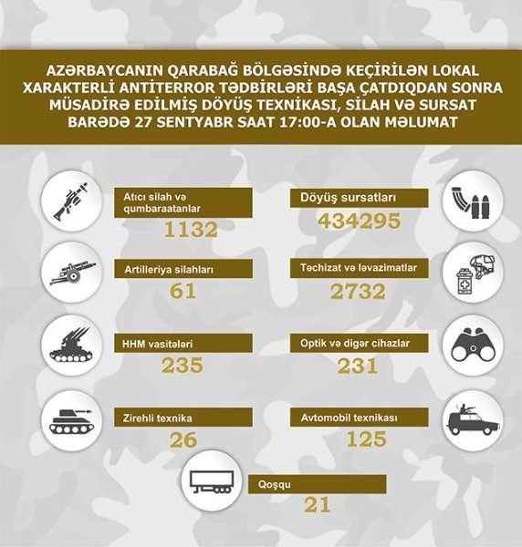 Müdafiə Nazirliyi Azərbaycanın Qarabağ bölgəsində keçirilən lokal xarakterli antiterror tədbirləri başa çatdıqdan sonra müsadirə edilmiş döyüş texnikası, silah və sursat barədə sentyabrın 27-si saat 17:00-a olan məlumatı açıqlayıb.