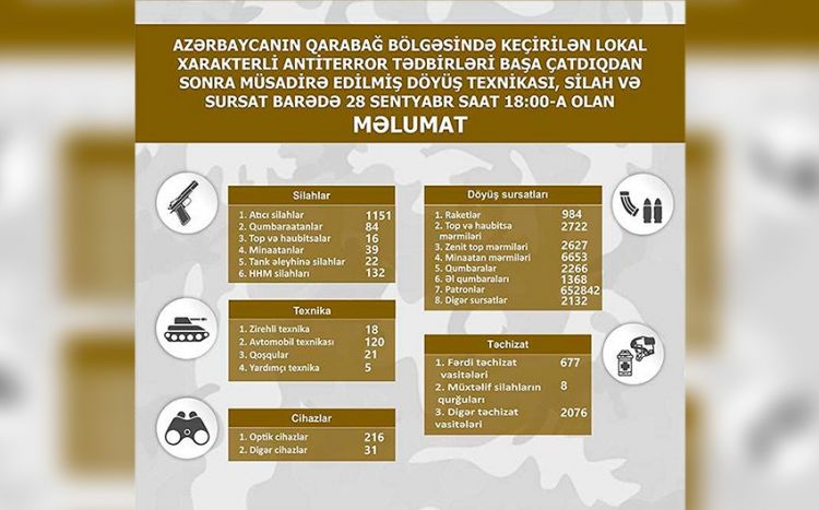 Qarabağda müsadirə edilmiş döyüş texnikası, silah və sursatın bugünədək olan siyahısı açıqlanıb.