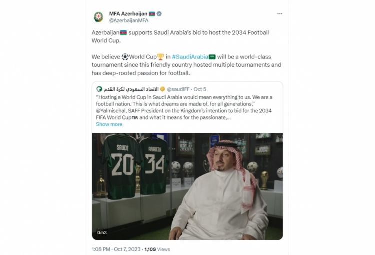 Azərbaycan Səudiyyə Ərəbistanının 2034-cü ildə futbol üzrə dünya çempionatına ev sahibliyi etmək təşəbbüsünü dəstəkləyir.