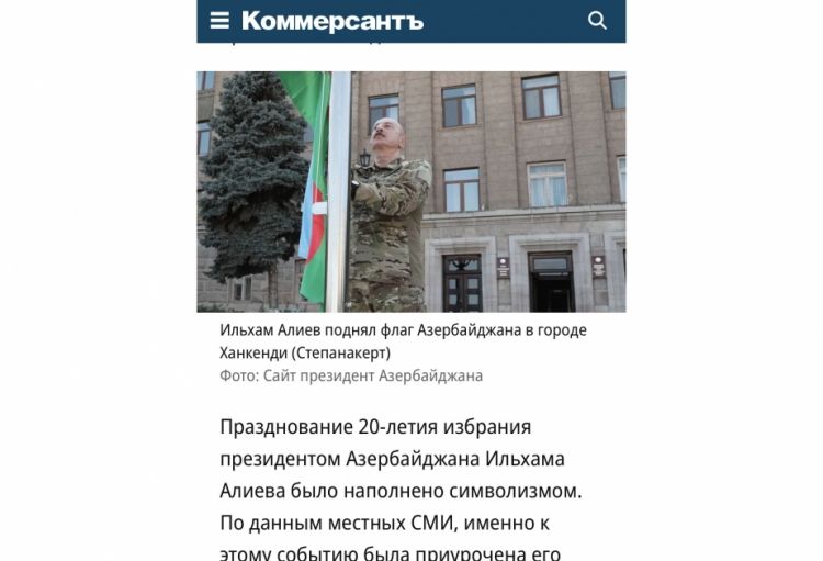 NUHÇIXAN xəbər verir ki, bu fikir Rusiyanın “Kommersant” qəzetinin Prezident İlham Əliyevin Xankəndi şəhərində Azərbaycan Respublikasının Dövlət Bayrağını ucaltmasına həsr olunmuş məqalədə yer alıb.