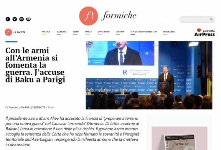 İtaliyanın “Formiche” saytı Azərbaycan Prezidenti İlham Əliyevin Fransanı Cənubi Qafqazda destruktiv fəaliyyətdən əl çəkməyə çağıran fikirlərinə geniş yer ayırıb.