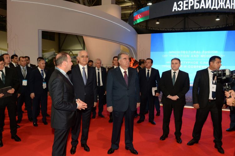 Daha sonra Tacikistan Prezidenti Qazaxıstan, Qırğızıstan, Tacikistan, Türkmənistan və Özbəkistanın milli stendləri ilə tanış olub.